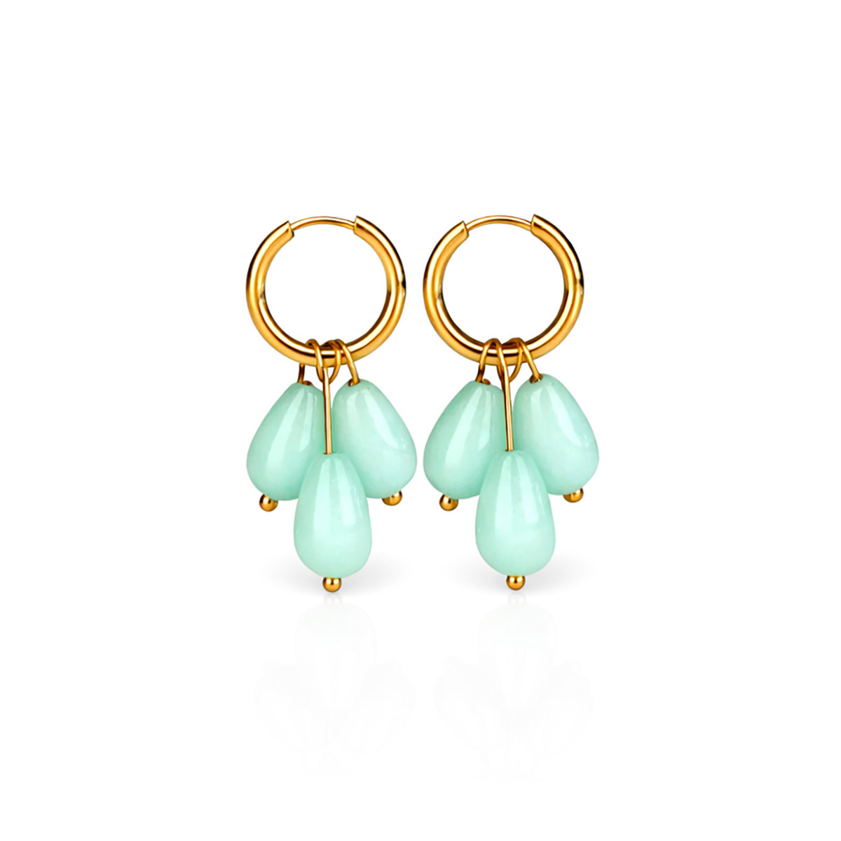 Smyckenas guldring (ytterdiameter 16 mm, tjocklek 2 mm) är tillverkad av högkvalitativt rostfritt stål och avslutad med en slitstark 18K PVD-guldplätering, vilket säkerställer att glansen och färgen bevaras under lång tid. Det hypoallergena materialet gör smycket bekvämt och säkert att bära även för känslig hud. Varje natursten (storlek ca 8 × 12 mm) är unik, så varje par smycken är individuellt och speciellt.