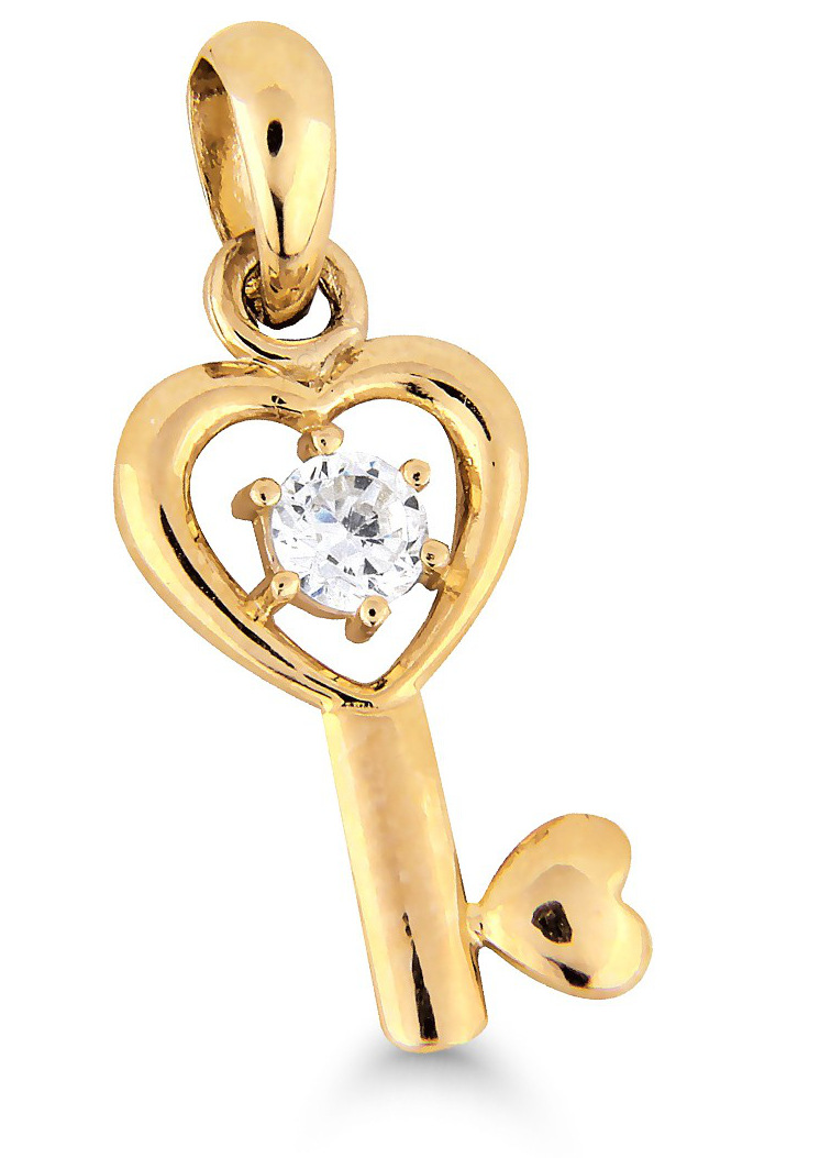 Guldhängsmycke nyckel och hjärta K-P8434Z. Berlocken är tillverkad i 14k guld och den är dekorerad med zirconia. Berlockens höjd är 13,3mm. Berlocken levereras i tillverkarens originalförpackning.