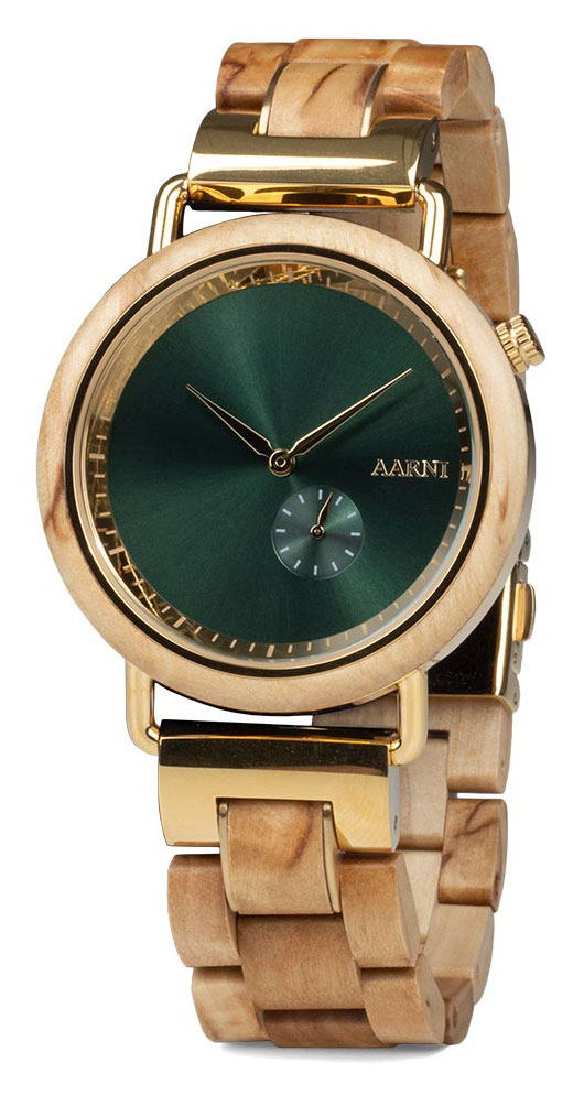Aarni Sirius masurbjörk-klockan är tillverkad av en masurbjörk som odlas i Hartola i Finland. Gulddetaljerna harmonierar vackert med masurbjörken. Klockans metalldelar är av 316L kirurgiskt stål och den drivs av ett japanskt Miyota 1L45 kvartsurverk. Boetten är 42 mm brett och 8,5 mm tjockt. Den gröna urtavlan skyddas av ett mineralglas. Armbandet är 20 mm brett och du kan justera längden efter dina personliga önskemål med hjälp av de medföljande verktygen. Klockan är vattenskyddad till 50m/5atm, vilket innebär att den har begränsad vattentålighet (simning rekommenderas inte). Aarni-träklockorna har en garanti på 3 år och levereras i tillverkarens originalförpackning.