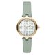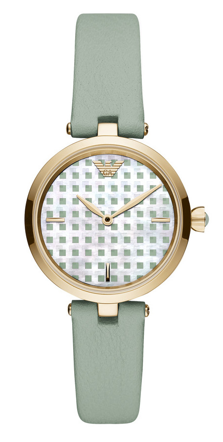 Amani ARIANNA AR11314 är en minfärgad damklocka med pärlemor urtavla och guldig ram. Armbandet är i läder och kronan är dekorerad med en halvädelsten, en cabochon. Armani klockor har 2 års garanti och skickas hem i tillverkarens originalförpackning.