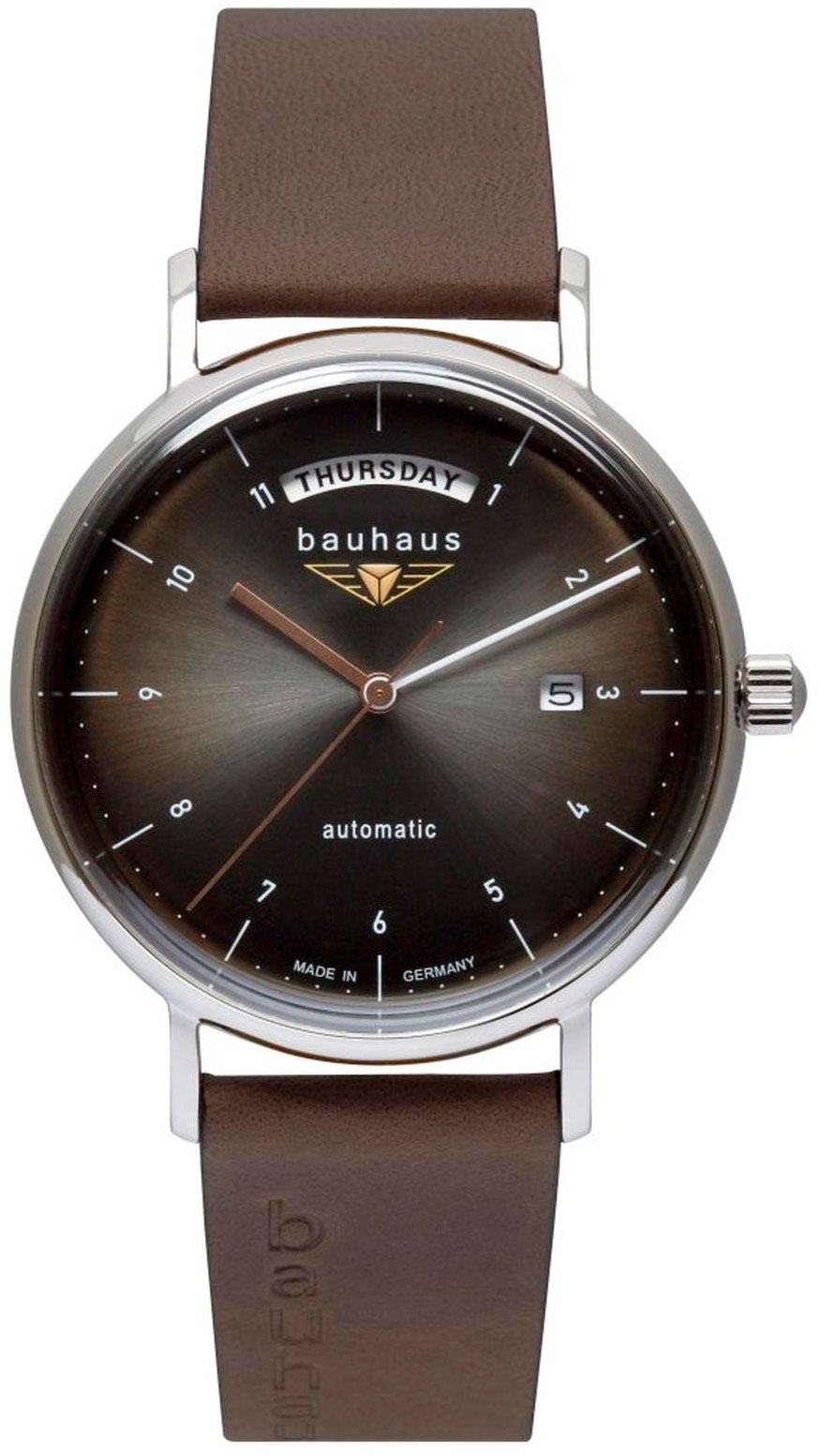 Bauhaus Classic Automatic 21622 automatisk klocka har en elegant och bred veckodagsdisplay vid klockan 12, som visar namnen på dagarna på engelska. Klockan 3 finns en datumdisplay. Den antracitgrå urtavlan skyddas av ett K1-säkerhetsglas. Citizen-Miyota 8285, ett japanskt automatiskt urverk med 21 juveler och 42 timmars gångreserv, kan observeras bakom ett transparent glas på boettens baksida. Detta analoga armbandsur har en boett i rostfritt stål som mäter 41 mm i bredd och 12 mm i tjocklek. Det bruna armbandet, tillverkat av äkta läder, mäter 145 till 210 mm i längd och 20 mm i bredd vid fästpunkten. Bauhaus Classic Automatic 21622 är tillverkad i Tyskland och producerad i Ruhla. Klockan tillhör vattenresistensklassen 50m / 5atm, vilket innebär att den har begränsad vattenresistens (simning rekommenderas inte).