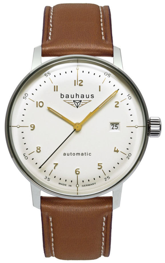 Bauhaus Dessau Automatic 2064-1 är en automatisk klocka med ett klassiskt och enkelt utseende. Den vita urtavlan har tydliga sifferindex och visare som säkerställer enkel läsning. Minut- och timvisarna, såväl som sifferindexen vid 12, 3, 6 och 9, har en Super-LumiNova-beläggning som lyser blått i mörkret, vilket gör klockan lätt att läsa var som helst. K1-säkerhetsglas, som är mer hållbart än konventionellt mineralglas, skyddar urtavlan, som också har ett datum. Klockboetten är tillverkad av rostfritt stål, som är 40 mm bred och 11 mm tjock. Det bruna armbandet är tillverkat av äkta läder, som är 20 mm brett och 170-210 mm långt. Bauhaus Dessau Automatic 2064-1 är tillverkad i Tyskland och producerad i staden Ruhla. Klockan är vattentålig till 50 m / 5 atm, vilket innebär att den är begränsat vattentålig (simning rekommenderas inte).