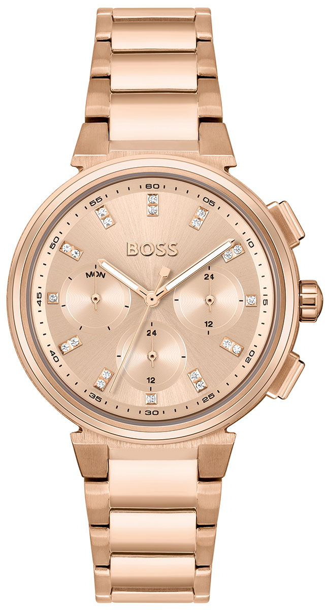 BOSS One 1502678 är en elegant damklocka med en 38 mm bred och 9,45 mm tjock boett i rostfritt stål i roséguld. Armbandet på den här klockan är ett roséguldfärgat rostfritt stålarmband med en bredd på 18 mm vid fästpunkten. Den roséguldfärgade urskivan på BOSS 1502678-klockan skyddas av mineralglas. Klockan är vattenskyddad till 50m/5atm, vilket innebär att den har begränsad vattentålighet (simning rekommenderas inte). BOSS-klockor levereras i tillverkarens originalförpackning och har en två ars garanti.