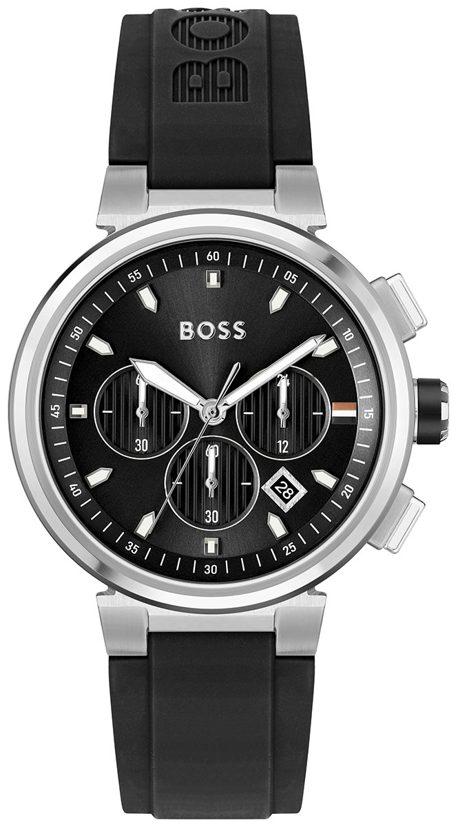 BOSS One Chronograph 1513997 är en elegant herrklocka med en 44 mm bred och 11,4 mm tjock boett i rostfritt stål i silverfärg. Den har ett svart silikonarmband med en bredd på 22 mm vid förankringspunkten och har en kronograf och datumvisning. Den svarta urtavlan på BOSS 1513997-klockan skyddas av mineralglas. Klockan är vattenskyddad till 50m/5atm, vilket innebär att den har begränsad vattentålighet (simning rekommenderas inte). BOSS-klockor levereras i tillverkarens originalförpackning och har en två ars garanti.