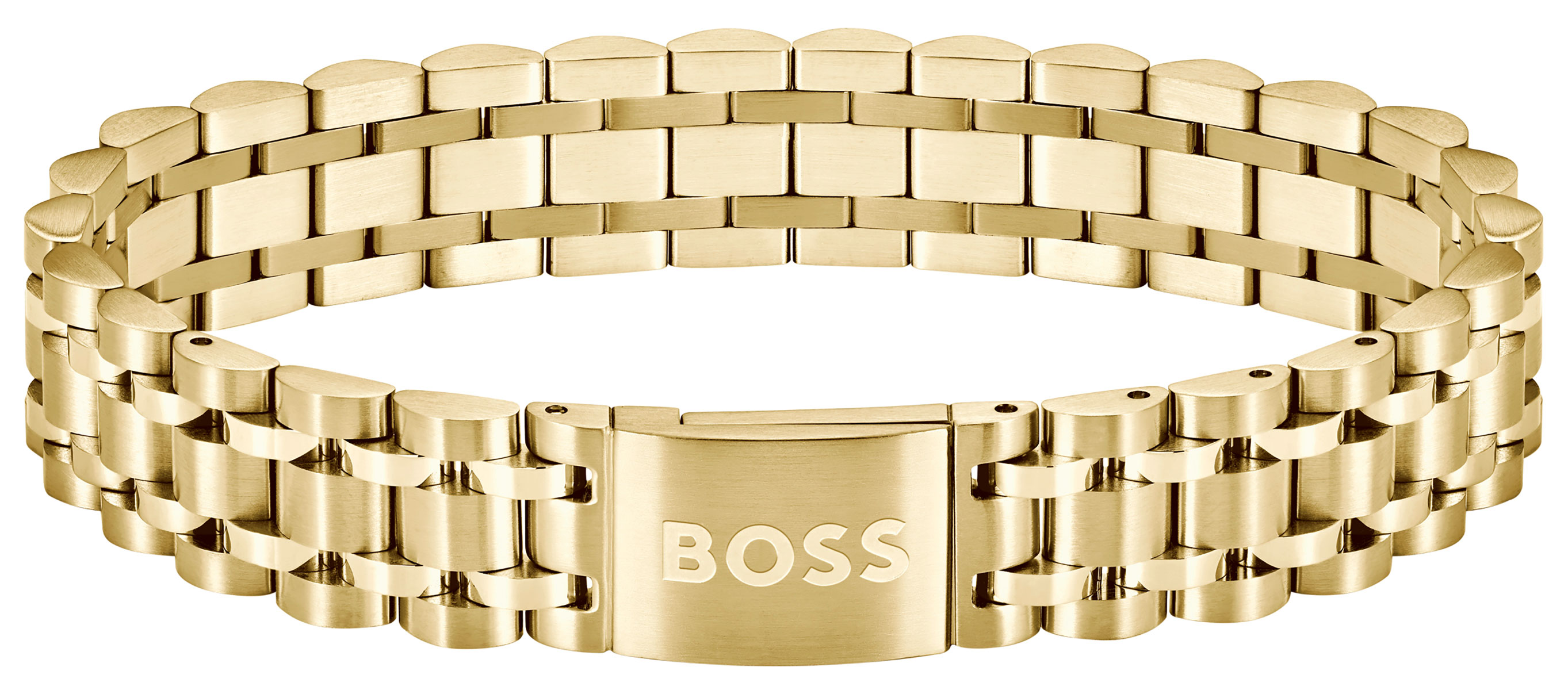 Guldfärgat BOSS Owan 1580645 armband för män är perfekt som accessoar. Armbandet har fatt sitt utseende från de klassiska klockarmbanden, och är tillverkat av rostfritt stål och mäter 19 cm i omkrets. BOSS Owan armbandet är en utmärkt presentidé, perfekt som konfirmations- eller examensgåva.
