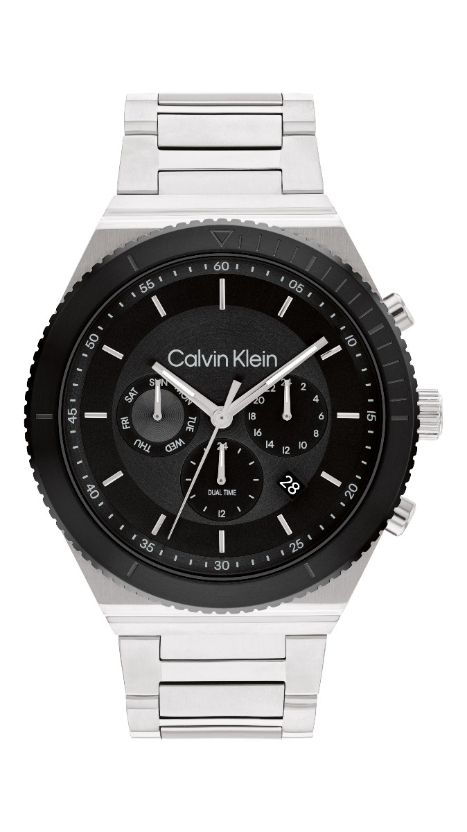 Calvin Klein Fearless dubbeltid silver svart 25200301 är en sportig herrklocka som visar dubbeltid. Detta 44,5 mm breda armbandsur har en stor svart urtavla med dag, veckodag och dubbeltid, en bra funktion för den som reser ofta. Klockan har också stora, lättlästa index samt en separat skala för sekunderna på urtavlans ytterkant. Den svarta bezellen omkring urtavlan fulländar looken. Calvin Klein Fearless dual-time silver black 25200301 armbandsur för män har 2 års garanti och levereras i tillverkarens originalfodral.