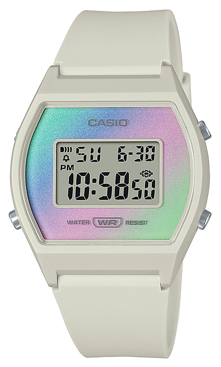 Den ursprungliga CASIO Vintage-designen väcks till liv i Casio Collection LW-205H-8AEF. Denna urbana klocka är tillverkad i vitt plast och har en fyrkantig hartsboett med en färgrika bezel med glitrande detaljer. Perfekt för sportiga stilar.