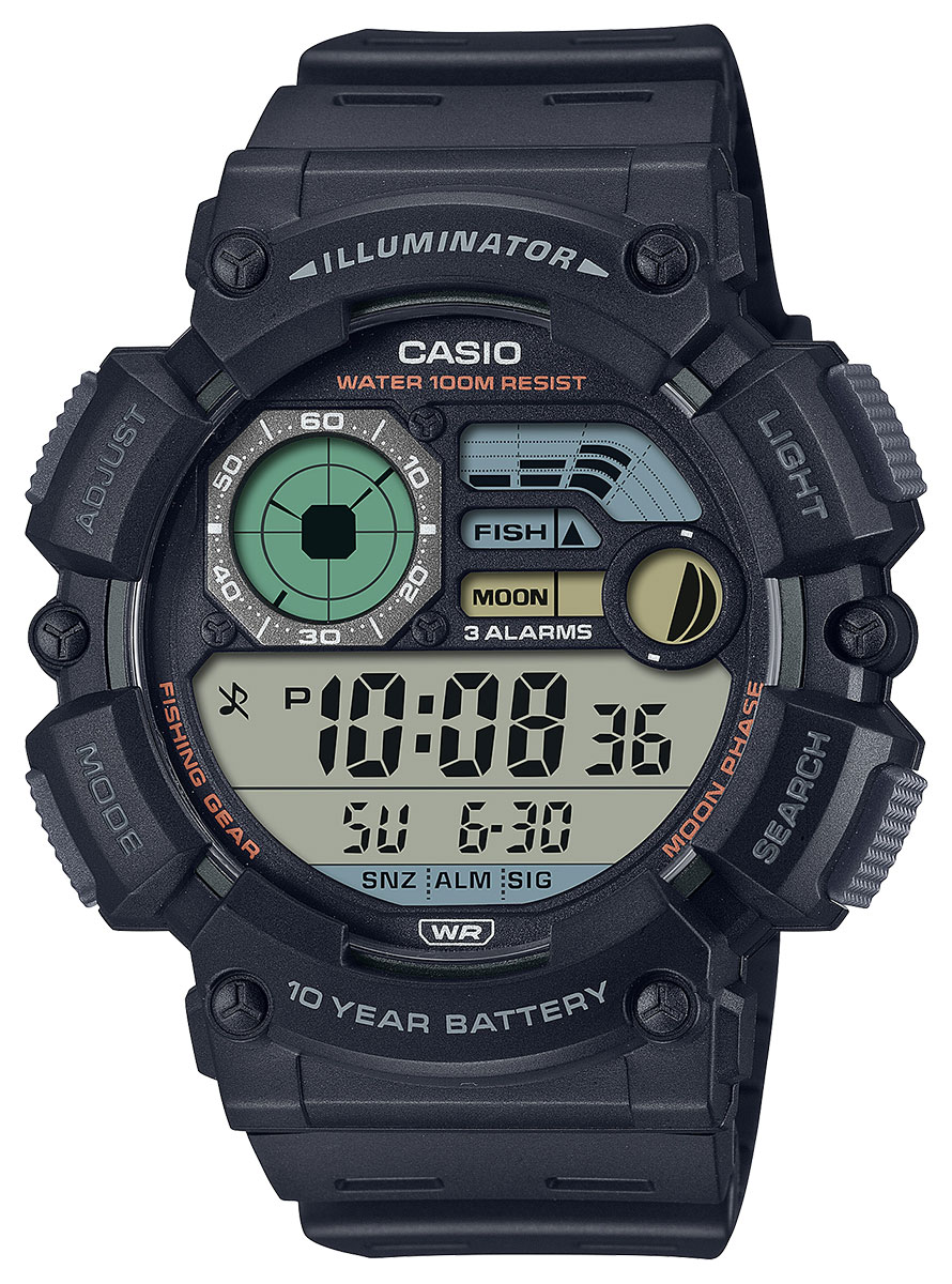 Casio Digital WS-1500H-1AVEF är ett snyggt digitalt armbandsur som är perfekt för utomhusaktiviteter. Den här fiskeklockan är designad och tillverkad av Casio i Japan och har en stor boett som mäter 50,1 mm och är 16,8 mm tjock. Den totala vikten är 58 gram, vilket gör den här fiskeklockan ganska lätt jämförelse med dess generösa storlek. Klockhuset är tillverkat av harts och det svarta armbandet är tillverkat av polyuretan. Ett plastglas skyddar den digitala urtavlan. Casio WS-1500H-1AVEF digitalklocka har en vattentäthet på 100 m / 10atm, vilket gör den lämplig för simning och snorkling. För entusiastiska fiskare har den här klockan en indikator eller huggtabellen som visar dig de perfekta tiderna för att fiska. Månfasen är också ett viktigt verktyg i denna utomhusklocka om du befinner dig på havet.
