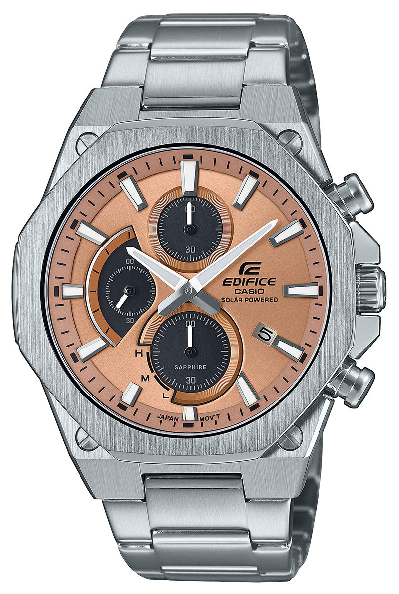 Casio Edifice EFS-S570D-5AUEF är en snygg solcellsdriven klocka som drivs av solljus och artificiellt ljus, så det finns inget behov av att byta batterier. Klockan har en platt åttkantig boett som skapar en sportig men samtidigt lyxig design. Klockan har en 44 mm bred och 9,7 mm tjock boett i silverfärgat rostfritt stål. Reptåligt safirglas skyddar urtavlan som har tre subdialrar för tidtagningsfunktioner, en dagindikator vid klockan 4 och självlysande visare och index för att underlätta avläsning i mörker. Casio Edifice EFS-S570D-5AUEF har en totalvikt på 133 gram och är vattentät till 100m/10atm, vilket gör den lämplig för ytdykning och snorkling.