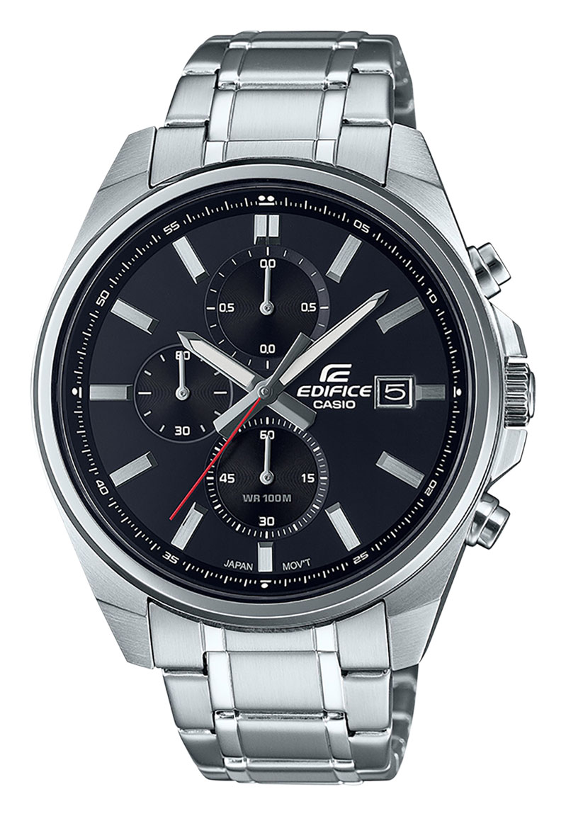 Casio Edifice EFV-610D-1AVUEF kronografklocka har en svart urtavla och ett silverfärgat stålboetten och armband. Urtavlan skyddas av ett mineralglas med självlysande visare. Du hittar datumet vid klockan 3 och andra funktioner är en timer (1/10s till 1h) och en säkerhetsmekanism som förhindrar att spännen öppnar sig vid olycka. Klockan har en vattentäthet på 100m/10atm, så du kan simma med den, men inte dyka. Casio-klockorna har två års garanti och levereras i tillverkarens originalfodral.