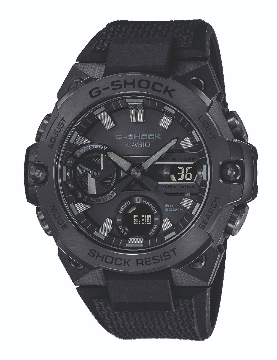 Helsvart Casio G-Shock Black on Black GST-B400BB-1AER är en stilig och nyttig soldriven herrklocka med stöttålig Carbon Core Guard konstruktion, Tough Solar solarurverket och Bluetooth-teknik. Hölje på denna monokromklocka är i IP-pläterad rostfritt stål och matchad med ett svart hartsarmband.