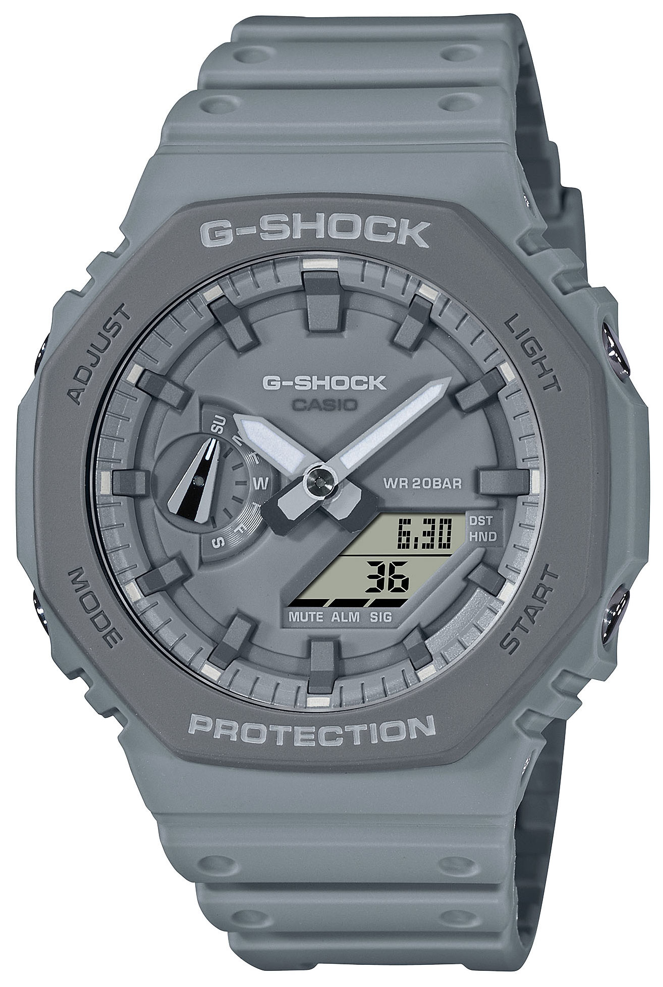 Casio G-Shock Earth Tone Color Series GA-2110ET-8AER monokrom klocka kombinerar stöttålig konstruktion med urban stil. GA-2110ET-8AER ana-digi klocka har en konstruktion med kolfiberförstärkt klockboett, självlysande visare och baton index, en separat display för veckodagar och en digital display med sekunder och digital tid. Dessutom är klockan lätt att belysa med en inbyggd LED . Klockan har en mycket varm och jordnära grå monokrom färg. Bandet och boetten är tillverkade av lättviktig polyuretan.