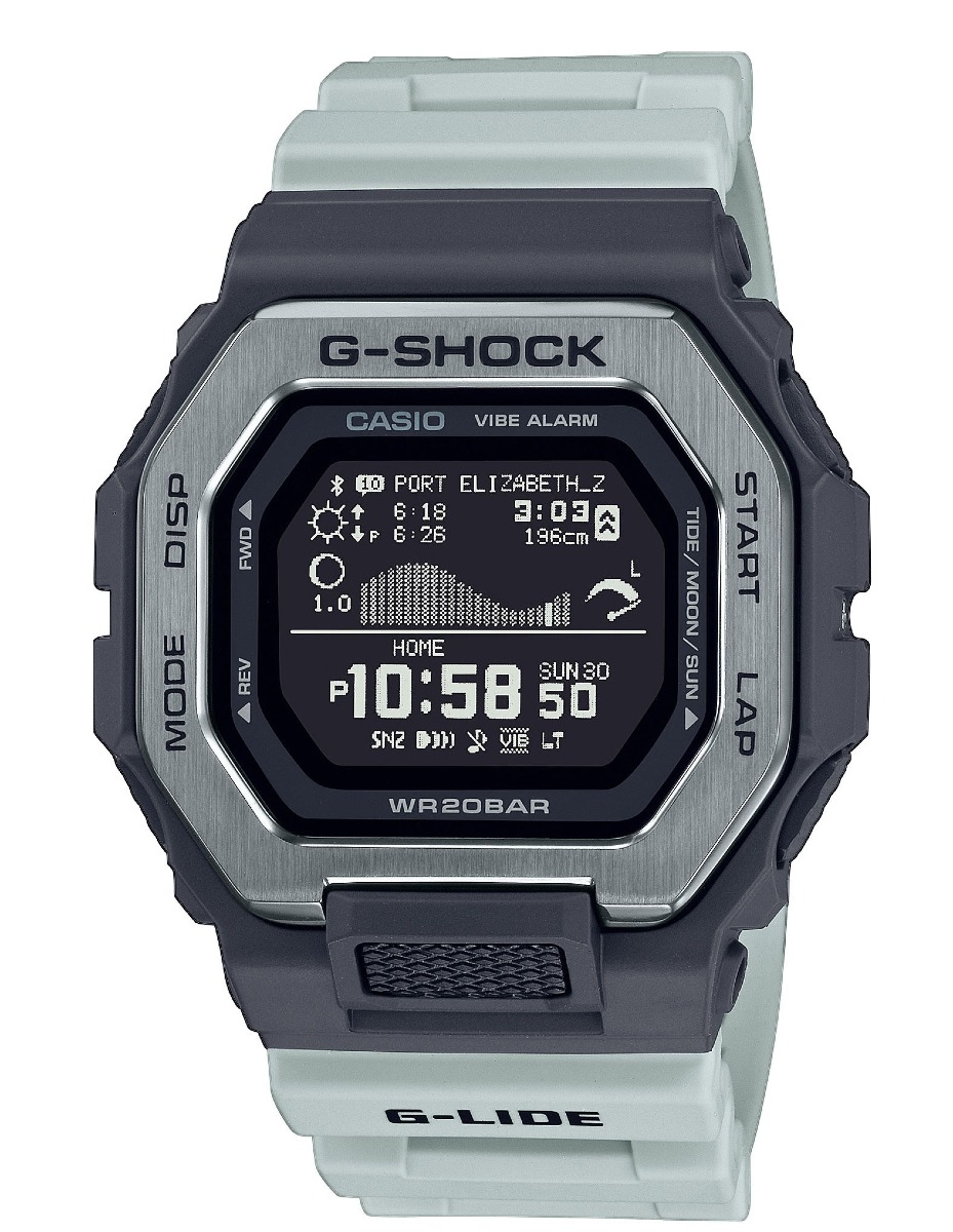Casio G-Shock G-LIDE GBX-100TT-8ER är en stöttålig och nyttigt hybridklocka för idrottare och surfare. Denna surfklockan levererar information om månfaser och variationer i havsvattnets nivå och kommer med en stöttålig struktur och 38 tidszoner. Boetten är vattenresistent ned till 200 meter. Via Bluetooth® kan Casio G-Shock G-LIDE GBX-100TT-8ER surfklocka ansluta trådlöst till din mobil och du får tillgång till en mängd av olika funktioner såsom stegräknare, kalorier, träninsgdata och life log. Bara ladda ner G-SHOCK Move appen och få information om antal steg, träning, kaloriförbrukning och mycket mer.