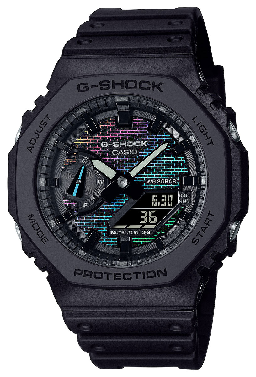 Casio G-Shock GA-2100RW-1AER är den välkända Casio-kvaliteten. Klockorna i den här kollektionen är perfekta för alla som letar efter en sportklocka. Den 45,4 mm breda och 11,8 mm tjocka boetten är tillverkad av svart harts. Den kolfiberförstärkta plastboetten med stöttålig konstruktion är det perfekta valet för den som söker en tuff klocka, medan mineralglas skyddar den regnbågsfärgade och tegelstensmönstrade urtavlan med stora Neobrite-lysande visare. På tavlan finns också subdial för veckodag och en vit LED-lampa som lyser upp tavlan när det är mörkt. Bland funktionerna finns timer, kronograf, världstid, 5 dagliga alarm, handskiftfunktion, timsignal och automatisk kalender. Med sitt speciella vattenmotstånd på 200m / 20atm är Casio G-Shock GA-2100RW-1AER också lämplig för vattensporter och till och med dykning.