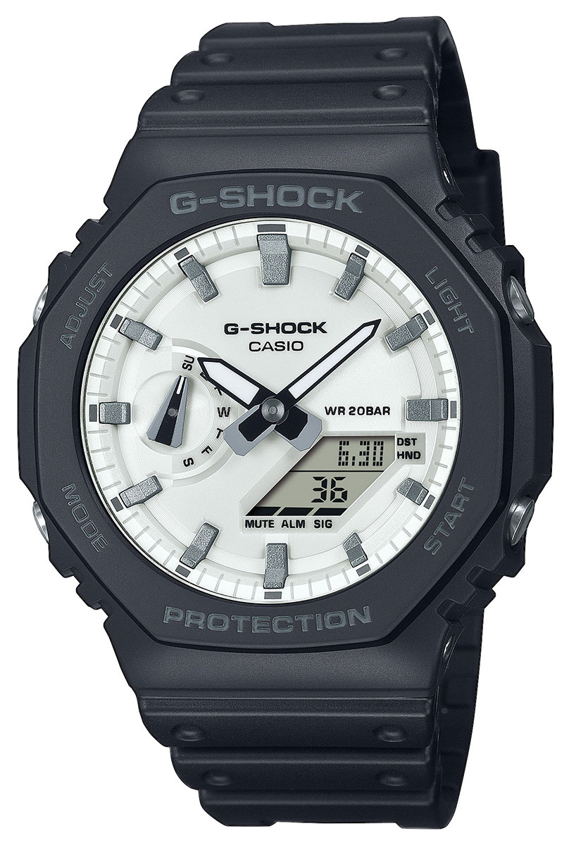 Casio G-Shock GA-2100WD-1AER är en slående G-SHOCK kronografklocka med en vit urtavla som accentueras mot en svart boett och armband. Den glansiga urtavlan är behandlad med en vit ångbeläggning, vilket skapar en fin kontrast mot den mattsvarta. Tack vare boetten och armbandet i harts är denna G-SHOCK extremt lätt och väger endast 51 gram. Boetten mäter 45,4 mm i bredd och 11,8 mm i tjocklek, medan hartsarmbandet mäter mellan 150 och 205 mm i längd. Mineralglas skyddar urtavlan, som har stoppur, timer, världstid, automatisk kalender, 12/24h, datum och veckodag samt Neobrite-belagda självlysande index och visare. Casio G-Shock GA-2100WD-1AER har en batteritid på 3 år och är vattenresistent till 200m/20atm, vilket gör den lämplig för simning och dykning.