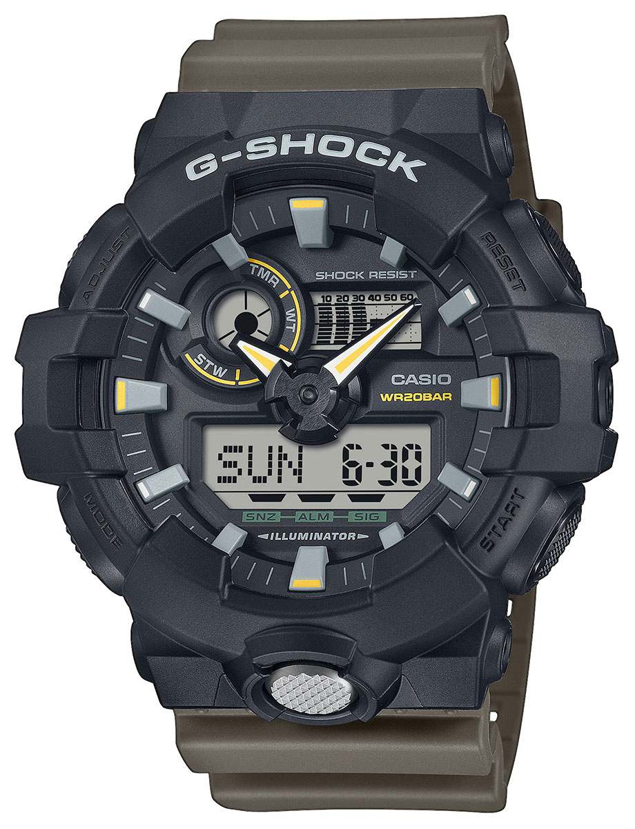 Digitalklockan Casio G-Shock GA-710TU-1A3ER kombinerar hållbar funktionalitet med smart stil. GA-710:s stora storlek har en svart och robust boett i harts med en bredd på 53,4 mm och en tjocklek på 18,5 mm. Längden på hartsarmbandet kan justeras från 145 till 215 mm. Urtavlan är utrustad med Neobrite-luminiscens och dubbla LED-lampor för enkel avläsning. Bland funktionerna finns världstid, timer, 5 alarm, 12/24-timmarsvisning och automatisk kalender. Klockan har en batteritid på upp till 5 år. Casio G-Shock GA-710TU-1A3ER har en totalvikt på 75 gram och är vattenresistent till 200m / 20atm, vilket gör den lämplig för simning och dykning.