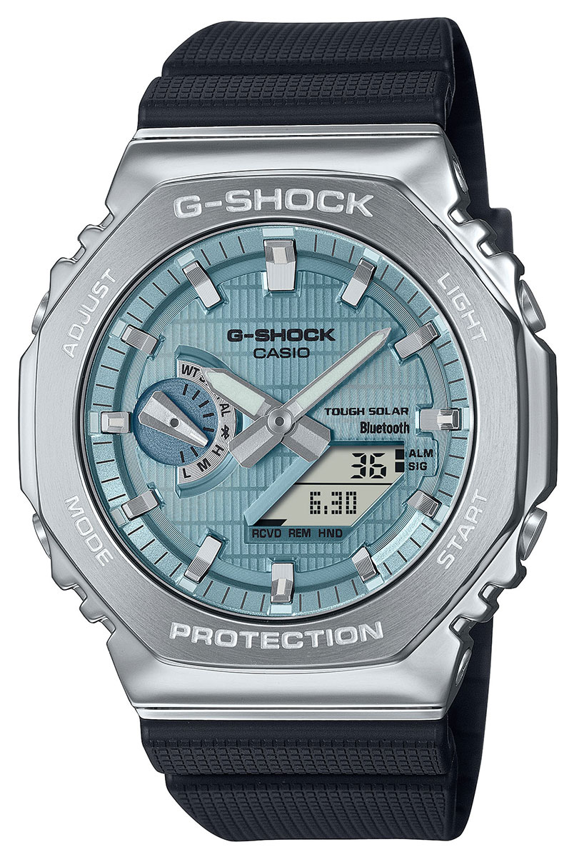 Casio G-Shock GBM-2100A-1A2ER är en briljanta G-Shock-klockan från GBM-2100-kollektionen, och erbjuder Smartphone Link-anslutning via Bluetooth® och Tough Solar solcellsdriven mekanismen. Denna stöttåliga klocka är noggrant konstruerad med en åttkantig boett i rostfritt stål som fulländar klockans högkvalitativa finish. Klockans boett mäter 44,4 mm i bredd och 11,9 mm i tjocklek. Urtavlan har dubbel LED-belysning och självlysande minut- och timvisare, vilket gör klockan extremt lätt att läsa av under alla förhållanden. Den ljusblått urtavlan skyddas av ett tåligt mineralglas. Det svarta armbandet av biobaserat harts har en längd på 145 - 215 mm. Bland funktionerna finns världstid, timer, stoppur, automatisk kalender, 5 dagliga larm, 12/24h, datum- och veckodagsvisning. Genom att ansluta din klocka till din smartphone via Bluetooth får du enkel och automatisk tidshantering, nya inställningar och påminnelser samt möjlighet att hitta din borttappade telefon via klockan. Casio G-Shock GBM-2100A-1A2ER är vattentålig till 200m / 20atm, vilket gör den lämplig för simning och dykning.