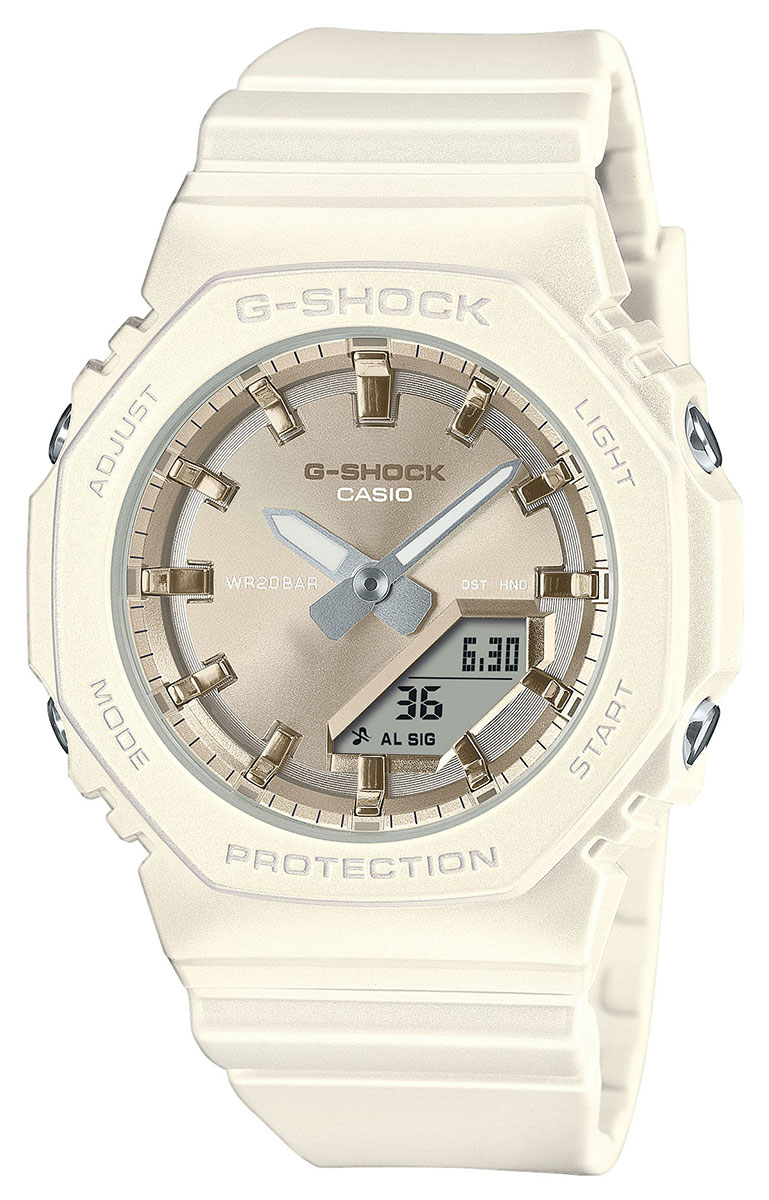 Casio G-Shock Small GMA-P2100ST-7AER urtavla har en glänsande, matt metallfinish som ger en vacker glans till den minimalistiska designen. De huvudsakliga hartskomponenterna i den vita ramen och armbandet är tillverkade av biobaserat harts, som består av förnybara organiska resurser och material som förväntas bidra till att minska koldioxidutsläppen och minska miljöpåverkan.