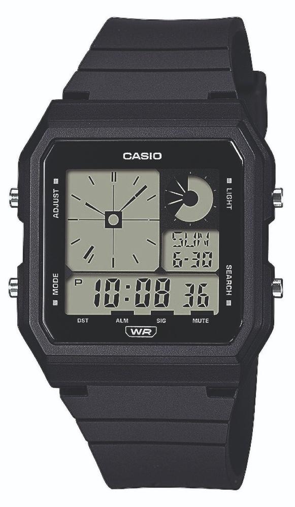 Casio Pop LF-20W-1AEF är Casios nya klockkollektion som kombinerar digitala och analoga klockdisplayer.Klockan har en 34 mm breda rektangulära boetten, vilket gör det enkelt att hålla koll på tid och datum. Armbandet och boetten är tillverkade av bioplast, vilket uppfyller det aktuella behovet av en klocka som respekterar miljön. Det monokroma färgschemat fulländar looken. Casio Pop LF-20W-1AEF digitalklocka har 2 års garanti och levereras i tillverkarens originalkartong.