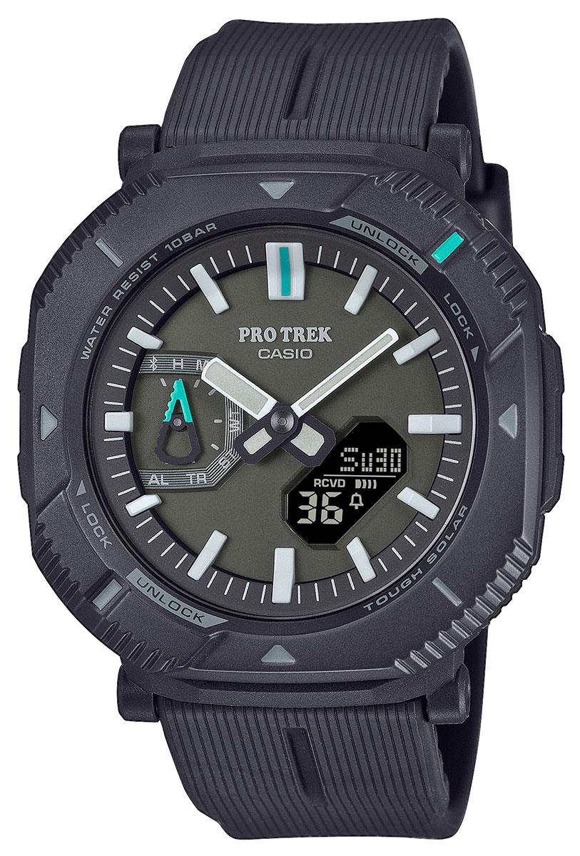Casio ProTrek PRJ-B001-1ER är den perfekta följeslagaren för långa stigar och lätta vandringar. Denna äventyrsklocka har den första roterande boetten i ProTrek-serien. Vrid på den roterande boetten för att växla mellan två olika stilar. Du kan vrida boetten så att den täcker knapparna för att förhindra att du råkar trycka på knapparna när du rör dig. Denna Casio ProTrek äventyrsklocka använder ett polyuretan armbandet som ger en bekväm passform. Armbandets längd varierar från 145 till 215 mm.