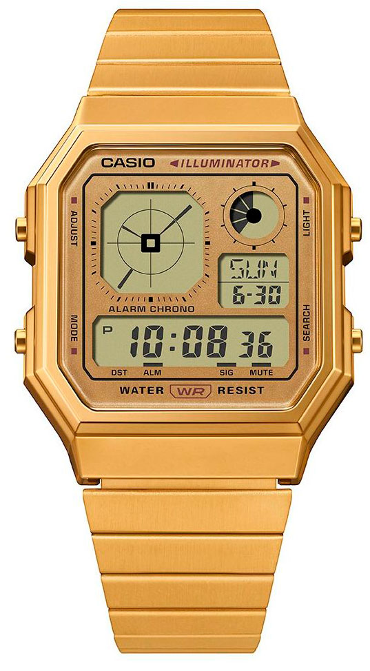 Casio Vintage A130WEG-9AEF digitalklockas retrofuturistiska urtavla kombineras med snygga guldtoner och kraftfulla accentfärger som visar en passion för olika prylar. Klockan är utrustad med en tunn och elegant åttakantig kropp, som är 33,9 mm bred och endast 9 mm tjock. Funktioner inkluderar världstid (4 städer), kalender, stoppur, 5 dagliga larm, dagjämningssignal och 12/24-timmarsvisning. Klockan har ett guldpläterat armband i rostfritt stål med en längd på 150 till 205 mm. Casio Vintage A130WEG-9AEF digitalklocka har en totalvikt på 54 gram och är stänksäker. Batteritid ca. 3 år.