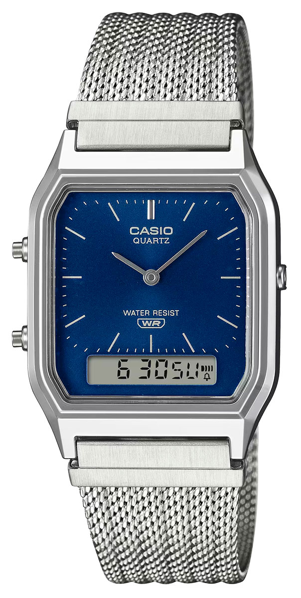 Casio tar sin ikoniska analog-digitala kombination till en ny era: den kantiga AQ-230 får ett elegant och elegant utseende tack vare ett fint vävt nätband. Stålremmen, som är färdigställd med en speciell pressmetod, skapar djup och textur, vilket ger klockan en sofistikerad vintage-look och utmärkt bärkomfort.