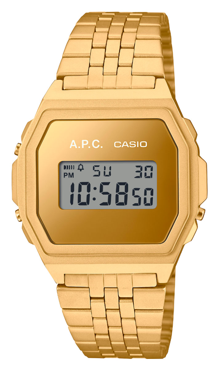 Casio Vintage Iconic Limited Edition A1000ACG-9ER limited edition unisex digitalklocka är ett samarbete mellan det globala franska varumärket A.P.C. och Casio och kännetecknas av sin vintage 70-talsdesign, smala och eleganta åttkantiga boett som kombinerar mode och funktionalitet. Boetten är 38 mm bred och bara 7,3 mm tjock, medan det guldfärgade armbandet i rostfritt stål passar handleder med en omkrets på mellan 150 och 205 mm. Med flera funktioner som alarm, stoppur och LED-lampa är denna klocka både funktionell och sofistikerad. Klockan har en batteritid på 3 år och är stänkskyddad. Denna digitala klocka är förpackad i en speciell låda och är också en utmärkt present.