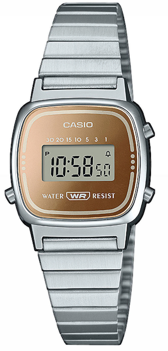 Den ursprungliga CASIO Vintage-designen väcks till liv i Casio Vintage Mini LA670WES-4AE. Denna damklocka i retrostil är tillverkad i silverfärgat rostfritt stål och har en klassisk fyrkantig hartsboett och armband i rostfritt stål. LCD-urtavlan är prydd med pronsfärgad finish. 2 års garanti.