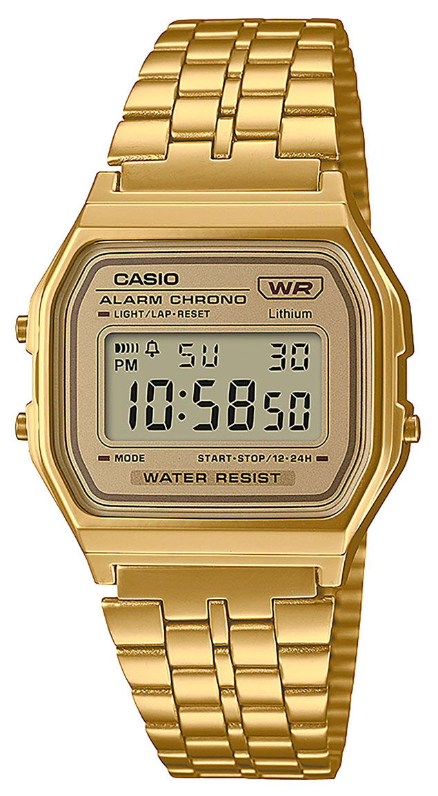 Den ursprungliga CASIO Vintage-designen väcks till liv i Casio Vintage Mirror Finish Band A158WETG-9AEF. Denna herrklocka i retrostil är tillverkad i guldfärgat rostfritt stål och har en klassisk fyrkantig hartsboett och armband i rostfritt stål.