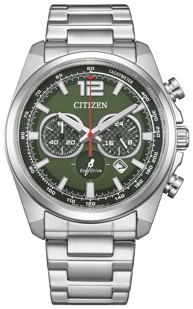 Citizen Eco-Drive Chronograph CA4640-50X är en högkvalitativ herrkronograf som drivs med solenergi via Citizen Eco-Drive-urverket. Den fulladdade energireserven räcker i cirka 9 månader. Boetten är tillverkad i rostfritt stål, med en bredd på 41 mm och tjocklek på 12 mm. Den tåliga mineralglaset skyddar den gröna urtavlan, som har indikator för batterinivå, delurtavlor för kronografen samt en tidtagning upp till 60 minuter. Datumfönstret är placerat mellan kl. 4 och 5, och de självlysande visarna och indexmarkeringarna gör det enkelt att läsa av tiden även i mörker. Citizen Eco-Drive Chronograph CA4640-50X har en total vikt på 143 gram och är vattentät till 100m / 10atm, vilket gör den lämplig för ytvattenaktiviteter och snorkling.