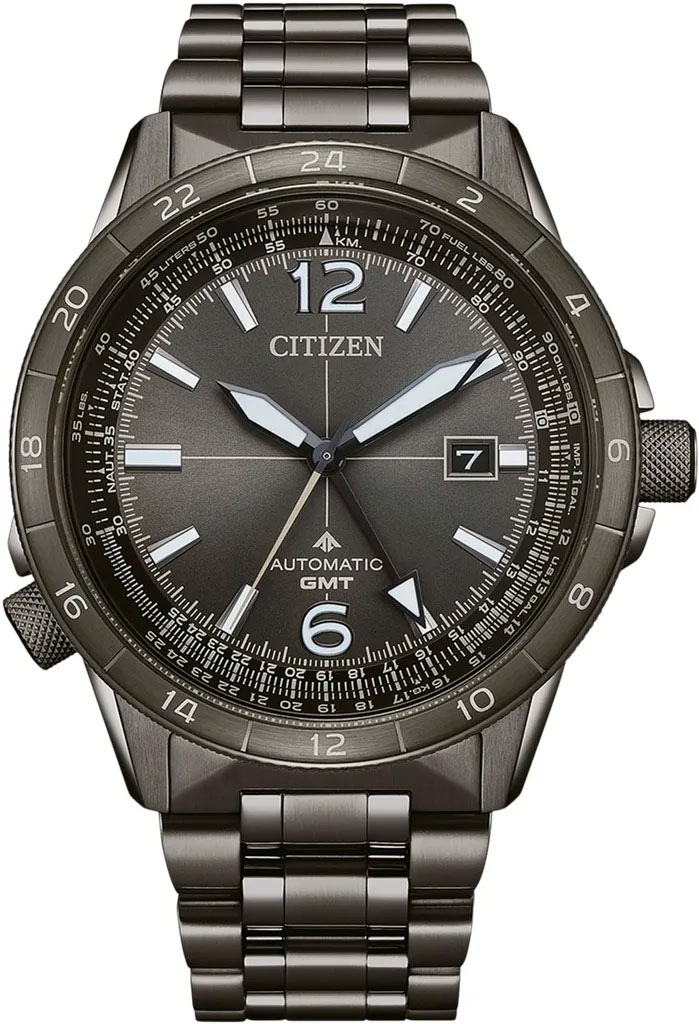 Citizen Promaster SKY Automatic NB6046-51H är den första GMT-klockan i Citizen SKY-serien. Denna automatiska pilotklocka är inspirerad av avancerad flygteknik och är full av innovativa detaljer. Klockans boett och armband är tillverkade av rostfritt stål, och det förbättrade magnetiska motståndet (16000 A/M) förhindrar att digitala enheter påverkar klockans noggrannhet negativt på ett avstånd av mer än 1 cm. Den svarta urtavlan är skyddad med ett antireflexbehandlat safirglas. Urtavlan har datum, stora lysande visare och index samt en GMT-visare som gör det möjligt att ställa in klockan på en annan tidszon. Urtavlan omges av en slide rule bezellen. Den automatiska pilotklockan har 50 timmars gångreserv och en noggrannhet på -10 / +20 sekunder per dag. Boetten mäter 44,5 mm i bredd och 12,67 mm i tjocklek, armbandet är 22 mm brett vid fästpunkten och klockans totalvikt är 100 gram. Tack vare den skruvbara kronan har klockan en utmärkt vattentålighet; 200m / 20atm, vilket gör den lämplig för simning och dykning.