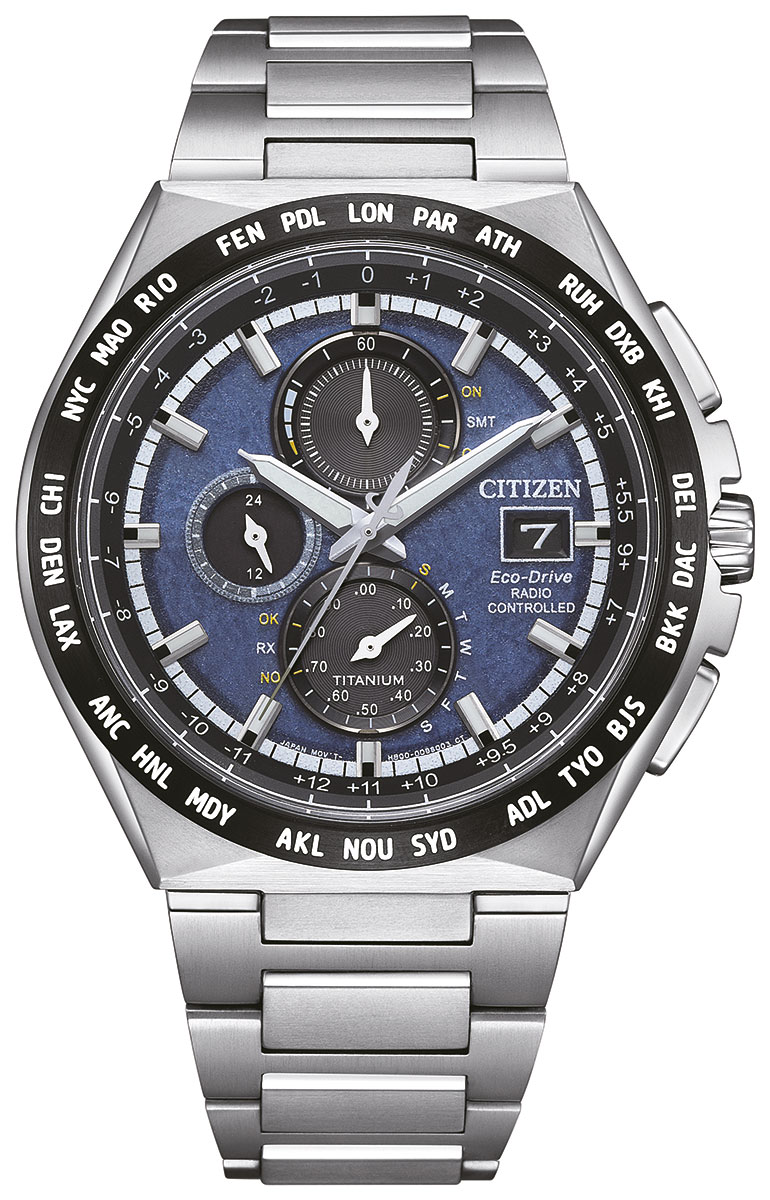 Citizen Radio Controlled Super Titanium Eco-Drive AT8238-84L är den nya kronografklocka i Super Titanium-serien, gjord för att vara en reskamrat, med omfattande världstidsfunktioner i hjärtat av klockan. Med 26 tillgängliga tidszoner är Tokyo, New York, Paris och många andra städer snabbt tillgängliga tack vare världstidsfunktionen. Det lätta och reptåliga Super Titanium gör den idealisk för resor. Boetten mäter 43,5 mm i bredd, 10 mm i tjocklek och väger 90 gram.