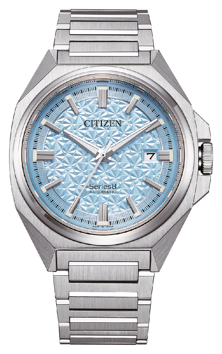 Citizen Series 8 Automatic NB6051-59L Limited Edition är en automatisk armbandsklocka i begränsad upplaga från Series 8-kollektionen, med en isblå strukturerad urtavla. De geometriska mönstren på urtavlan glittrar och reflekterar ljus – den friska isblå färgen är inspirerad av kristallklart vatten. Den åttakantiga boetten med sina rena linjer och detaljerade finish speglar urtavlans geometriska formspråk. Endast 1800 exemplar har tillverkats globalt.