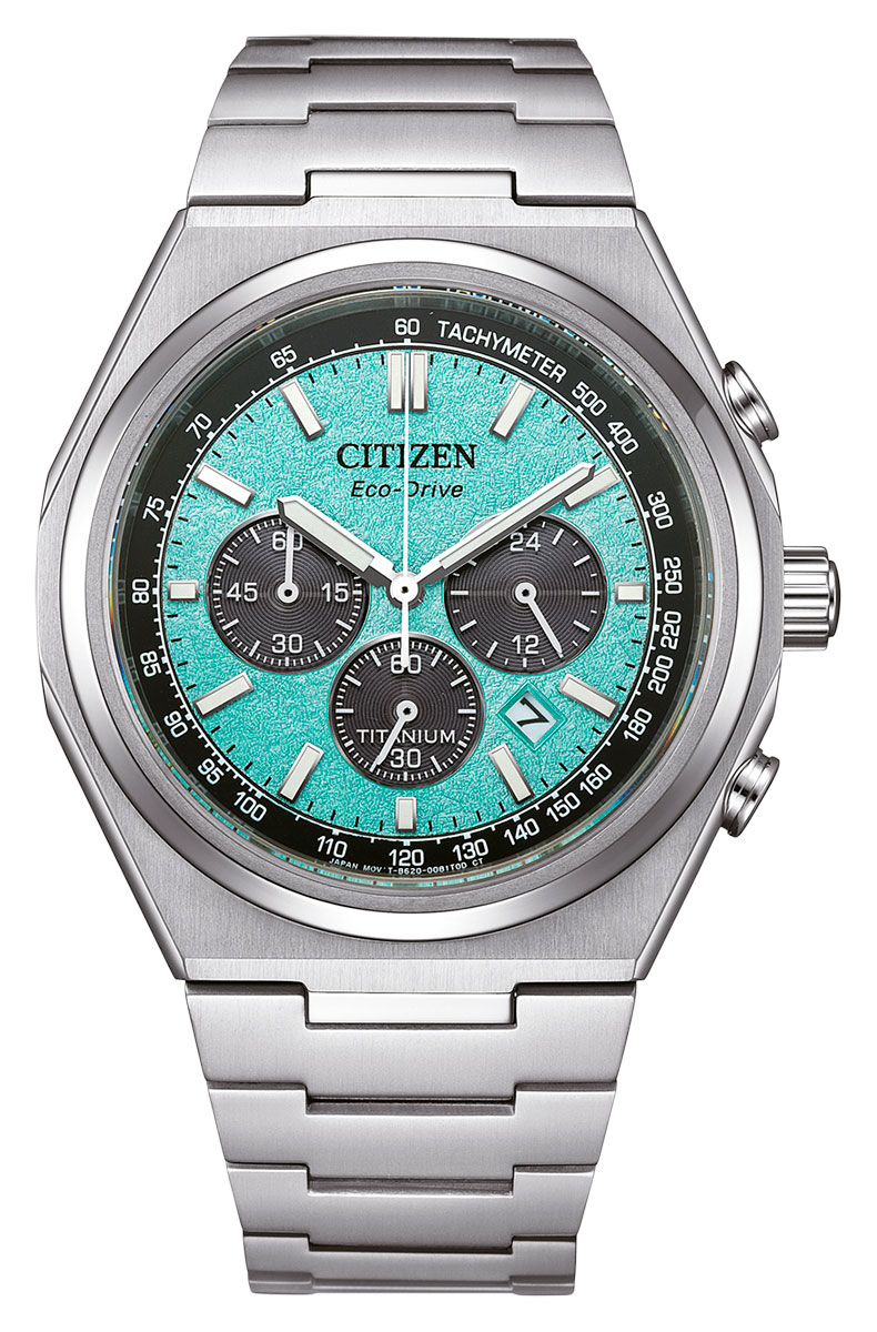 Citizen Super Titanium Chrono CA4610-85M är en soldriven kronografklocka som är full av funktionalitet och elegans. Det Eco-Drive urverket drivs av ljus och håller i upp till 270 dagar när det är fulladdat, utan behov av separata batterier. Under safirglaset fanns en turkosfärgad panda urtavla med tidtagning (max.60 min,1/5 sek), datum, självlysande visare och index. Klockan har en 42,5 mm bred boett i Super Titanium™, som är mer än fem gånger hårdare än en stålboett. Armbandet är också tillverkat av Super Titanium. Citizen CA4610-85M titanklocka är vattentålig till 100m/10atm, vilket gör den lämplig för dykning och snorkling.