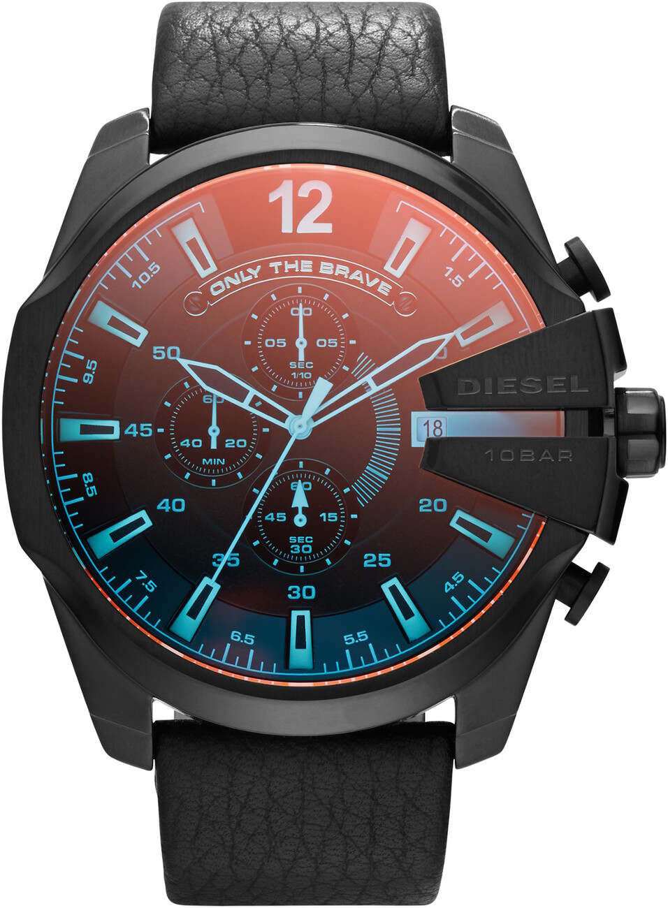 Diesel DZ4323 Mega Chief Iridescent Crystal Leather är en imponerande herrklocka med ett svart läderarmband. Urtavlan är svart, men det iridescent reflekterande glaset gör att den ser riktigt unikt ut. Klockan har en bredd på 53 mm och en tjocklek på 14 mm. Armbandets bredd vid fästpunkten är 26 mm. Funktionerna inkluderar kronograf och datum. Dieselklockor har 2 års garanti och levereras i tillverkarens originalförpackning.