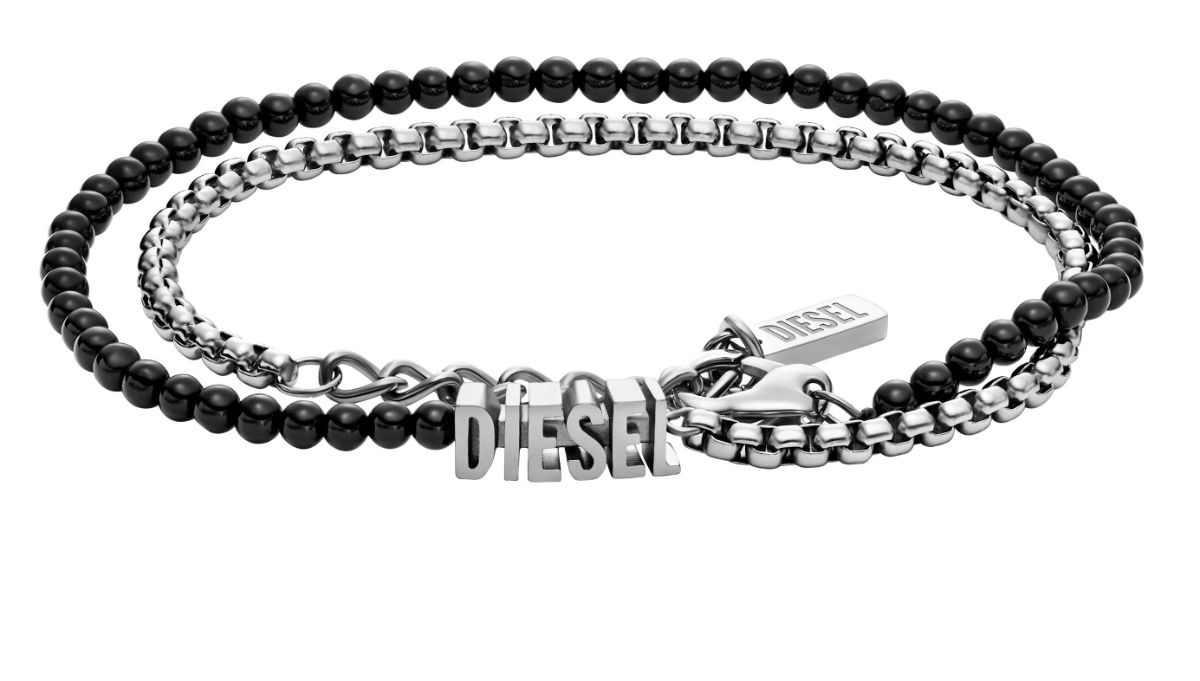 Diesel Font armband DX1542040 har två kedjor och en 22 x 8,05 mm bred Diesel-logotyp. Armbandet är tillverkat av rostfritt stål och de svarta onyxpärlorna ger en snygg kontrast. Papegojlåset gör att kedjorna kan separeras och användas tillsammans eller separat. Armbandets längd är justerbar mellan 18,5 och 21,5 cm. Diesel Font-armbandet DX1542040 levereras i tillverkarens originalask.
