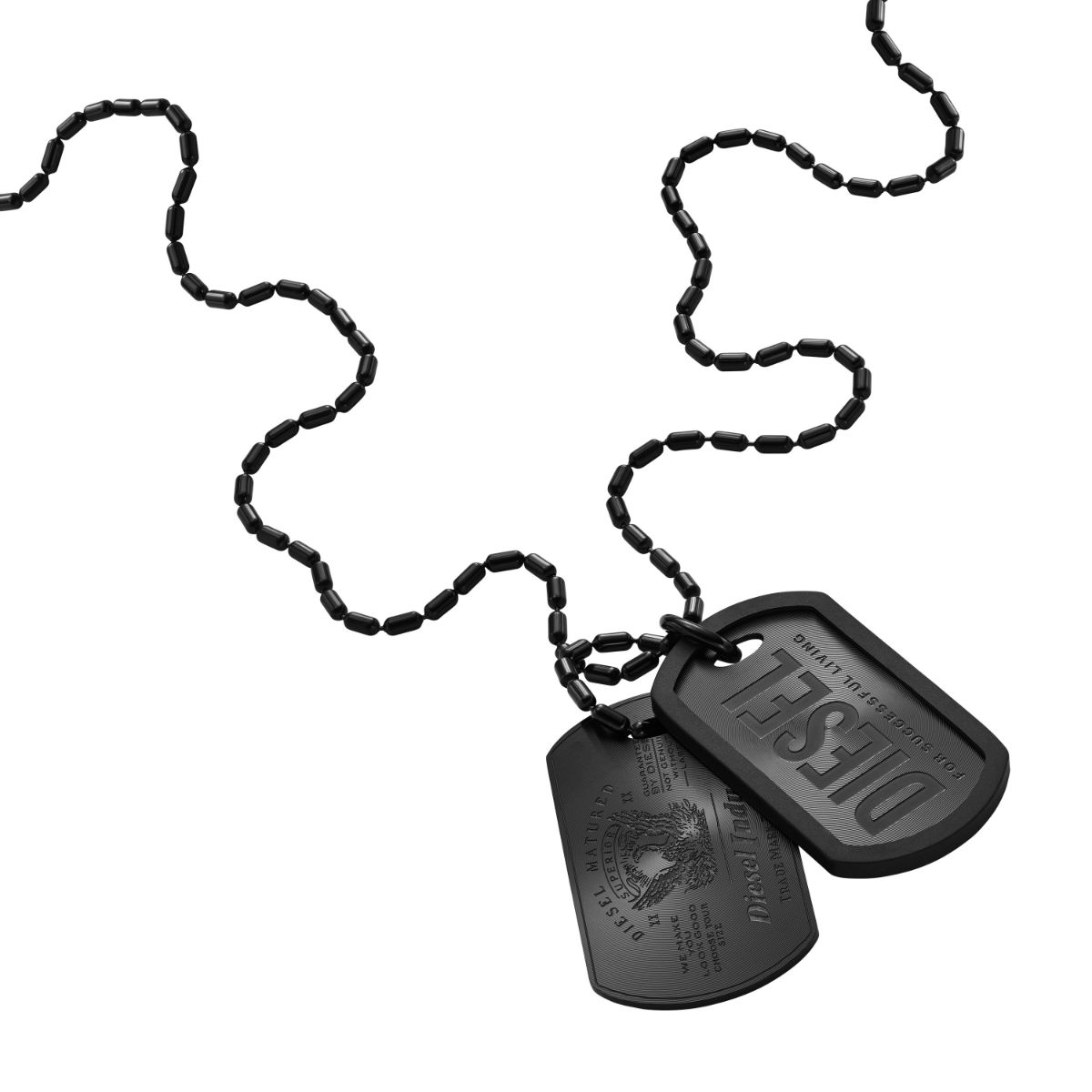 Diesel Font stålhalsband DX1554001 är tillverkat av svart rostfritt stål och pryds av två plattor som mäter 26,3 x 45,7 mm. Halsbandet med ID-bricka är en snygg accessoar för män i alla åldrar och kedjelängden är 60 cm. Diesel Font stålhalsband DX1554001 levereras i tillverkarens originalask.