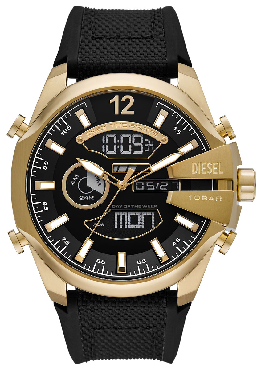 Diesel Mega Chief DZ4634 är en robust herrklocka som passar vid varje tillfälle. Boettens bredd på denna ana-digi klocka är 51mm och tjockleken är 15,5mm. Klockan har mångsidiga funktioner, som till exempel tidur och kalender. Urtavlan är dekorerad med "Only the Brave" texten. Armbandets lug bredd är 26mm. Diesel klockor har garanti upp till två år och de levereras i tillverkarens originalförpackning.