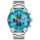 Diesel Spiked DZ4655 är ett stort armbandsur för män med en 49 mm bred boett i rostfritt stål i silverfärg. Armbandet på den här klockan har en silverfärgad stållänk med en bredd på 24 mm vid fästpunkten. Den turkos semi-panda urtavlan på Diesel DZ4655 har tre svarta subdialer med kronograf och en datum som ger en stor kontrast. Urtavlan skyddas av mineralglas. Klockan är vattenskyddad till 50m/5atm, vilket innebär att den har begränsad vattentålighet (simning rekommenderas inte). Diesel-klockorna levereras i tillverkarens originalförpackning och har en två ars garanti.