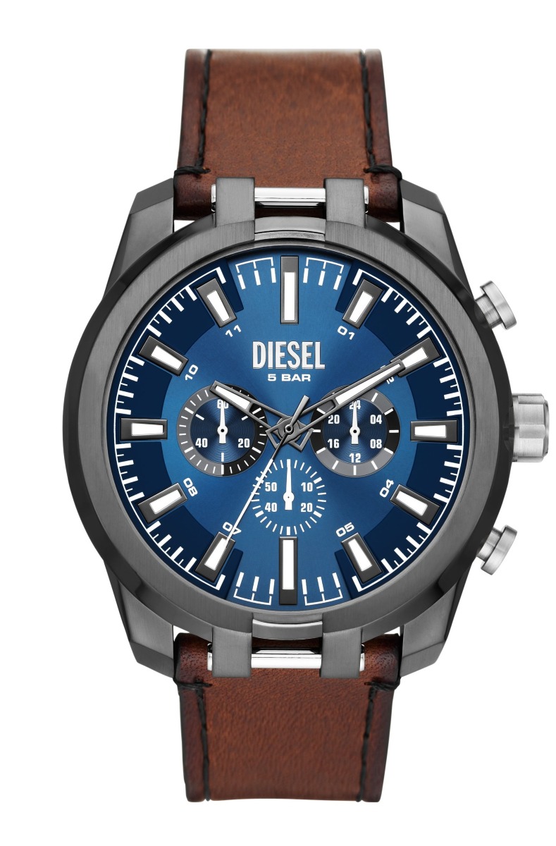 Diesel Split Chronograph brown leather DZ4643 är en snygg herrklocka för dig som letar efter en lite större klocka. Klockan har en 51 mm bred kropp i rostfritt stål och ett brunt läderarmband med en bredd på 26 mm vid fästpunkten. Klockan har en kronograf och 24-timmarsvisning. Den blå urtavlan på Diesel DZ4643 skyddas av ett mineralglas. Klockan är vattenskyddad till 50m/5atm, vilket innebär att den har begränsad vattentålighet (simning rekommenderas inte). Diesel klockorna levereras i tillverkarens originalförpackning och har en två ars garanti.