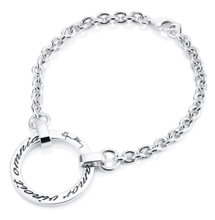 Efva Attling AVO armband 14-100-00531/0018 är tillverkat i sterling silver och har texten "Amor Vincit Omnia". Hängets diameter är 25 mm och kedjans längd är 18 cm. Efva Attling-smyckena levereras i tillverkarens originalask.