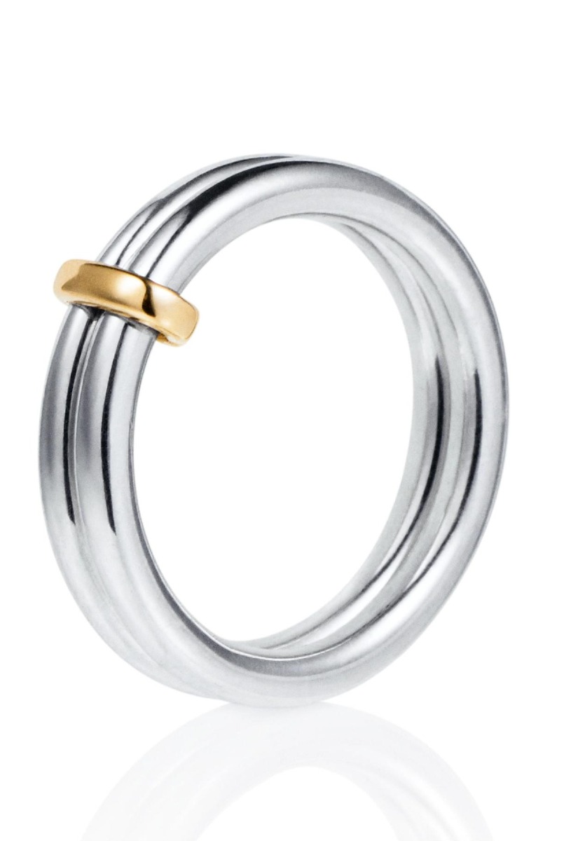 Efva Attling Little Divorced With Children Thin ring 13-106-02138-1700 har två ringar av återvunnet silver som representerar relation mellan två människor, och den mindre länken, som representerar ett barn. Ringen som representerar barnet är av 18 karats guld. Bredden på skenan är 2 mm och 2,5 cm vid guldringen. Silverringens storlek är 17 mm. Efva Attling-smycket levereras i tillverkarens originalförpackning.