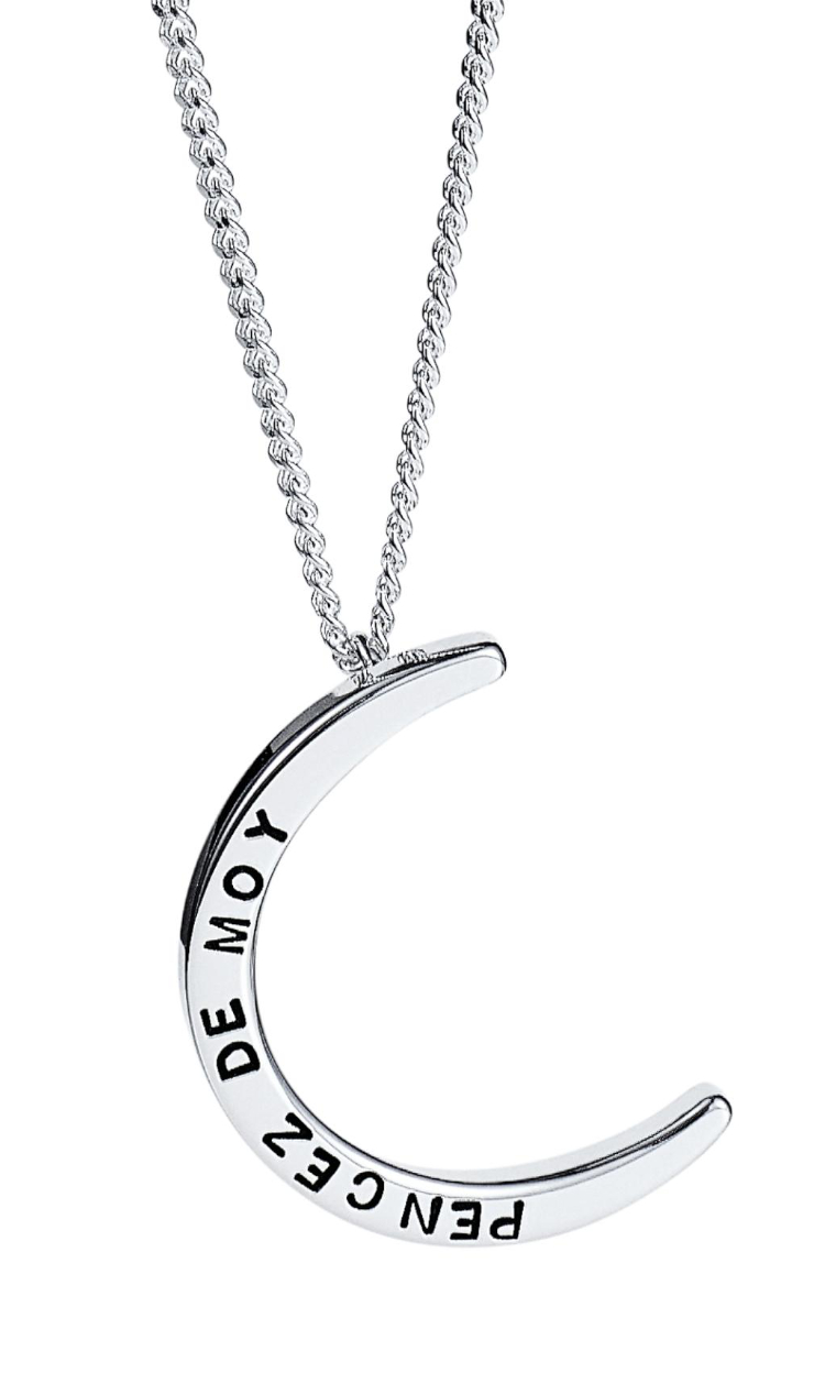 Efva Attling Pencez Moon halsband 10-100-02077/4045 är graverat med den fornfranska texten Pencez De Moy, Tänk på mig. Kedjans längd är justerbar till 40/42/45 cm, hängets storlek är 16 x 22 mm. Efva Attling-smyckena levereras i tillverkarens originalask.