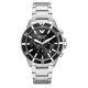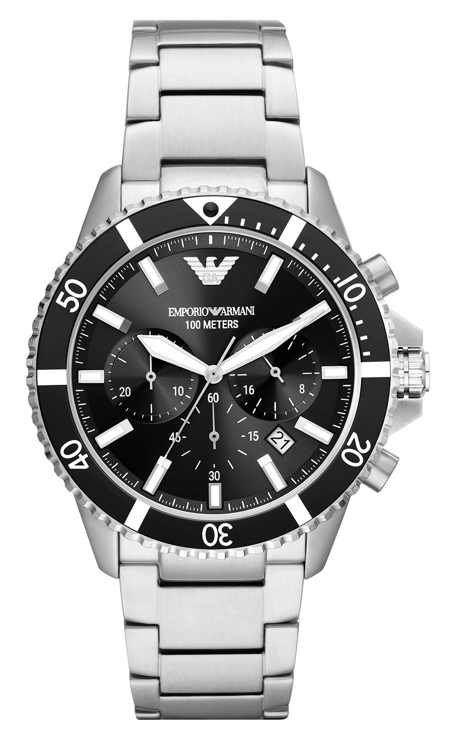 Emporio Armani AR11360 Diver Silver är en stilig dykarklocka helt i rostfritt stål med 100 m vattentäthet, en svart sunray urtavla, och självlysande markörer och händer för bästa möjliga läsbarhet. Boetten bredd är 43 mm, och den matchas med en oysterlänk. Emporio Armani klockor skickas hem i tillverkarens originalförpackning.