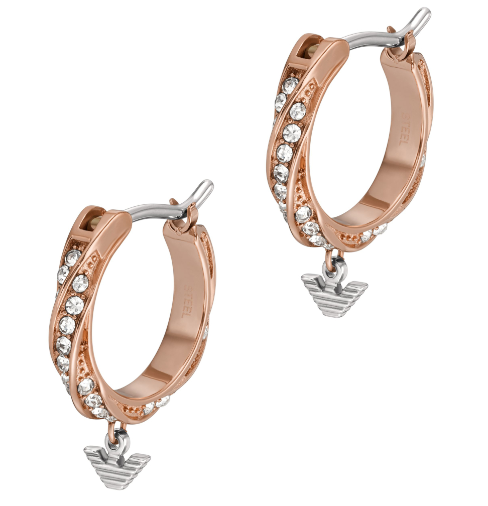 Letar du efter ett snyggt smycke för vardag och kväll? Emporio Armani Sentimental Logo Earrings EGS3006221 är ett mångsidigt smycke i roséguld och silverfärgat stål. Looken avslutas med ljusa zirkoner. Storleken på örhängena är 15 mm. Emporio Armani-smycken levereras i tillverkarens originalförpackning.