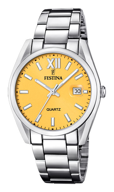 Den färgrika Festina Classic gents F20683/8 är ett klassiskt armbandsur för herrar med ett japanskt Miyota 2115-urverk och en färgglad urtavla, perfekt för att komplettera din vardagsoutfit. Klockan har en gul urtavla med prickar och tydliga linjeindex. Självlysande visare och index säkerställer att du kan läsa av tiden även i mörker. Boetten är 40 mm bred och 9 mm tjock, armbandet i rostfritt stål är 145 - 210 mm långt och 20,95 mm brett vid fästpunkten. Festina F20683/8 har en vattenresistensklassning på 50m/5atm, vilket innebär att den har begränsad vattenresistens (simning rekommenderas inte).