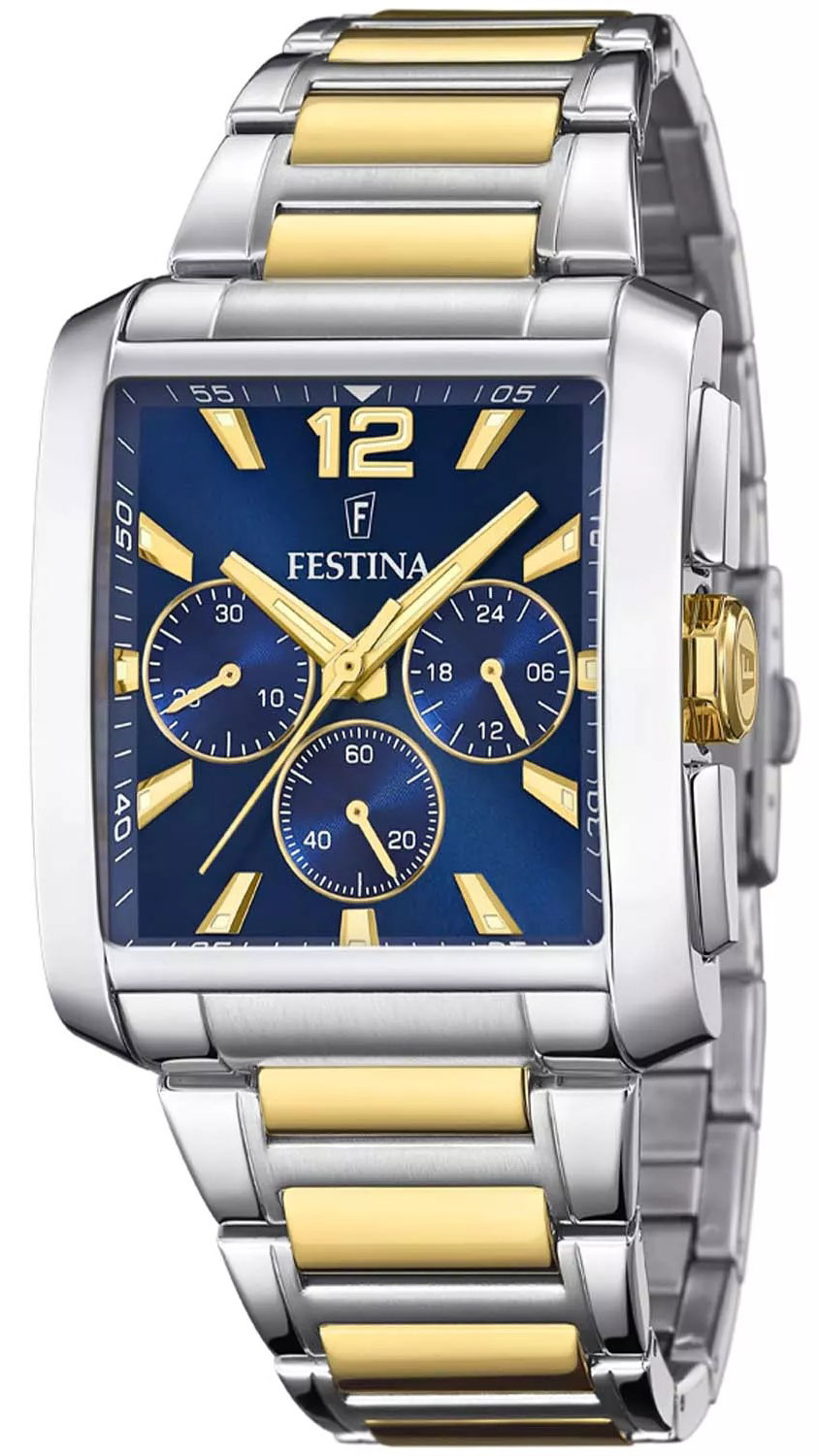 Festina On the Square Chronograph F20637/1 är en silverfärgad, rektangulär kronografklocka som är både elegant och funktionell. Denna kvartsdrivna armbandsur är tillverkad av rostfritt stål och har en boettbredd på 37 mm. Den blå urtavlan är skyddad av mineralglas, som har underurtavlor för kronografavläsning och självlysande visare och index för att underlätta avläsning av urtavlan i mörker. Det tvåfärgade stålarmbandet är 29 mm brett. Festina On the Square Chronograph F20637/1 är vattentålig till 50 m / 5 atm, vilket innebär att den är begränsat vattentät (simning rekommenderas inte).
