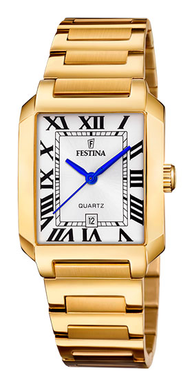 Festina On the Square ladies F20680/1 armbandsur för dam har en distinkt fyrkantig urtavla som kombinerar elegans och klassisk design. Den guldfärgade boetten är 33 mm bred och 8,5 mm tjock. Det guldfärgade armbandet i rostfritt stål har en längd på 130 - 185 mm och en bredd på 20,5 mm vid fästpunkten. Klockan har en vit urtavla som skyddas av mineralglas med datum, eleganta romerska numeriska index och blånerade visare. Festina F20680/1 har en vattenresistensklassning på 50m/5atm, vilket innebär att den har begränsad vattenresistens (simning rekommenderas inte).