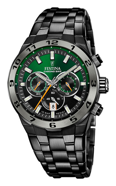 Festina Special Edition gents F20673/2 kronografklocka för män har ett fantastiskt helsvart färgschema från boett, knappar, ram och armband. Klockan har en 44,5 mm bred boett tillverkad av 316L kirurgiskt stål. Detta säkerställer att klockan behåller sin funktionalitet i många år framöver. Armbandet i rostfritt stål är 28,5 mm brett vid fästpunkten och 150 - 215 mm långt. Under mineralglaset skyddas urtavlan av en urtavla med grön topp och svart botten. Urtavlan har kronograffunktioner, datum- och 24-timmarsvisning. Självlysande visare och index säkerställer att du kan läsa av tiden även i mörker. Festina F20673/2 har en vattenresistens på 100m/10atm, vilket gör den lämplig för badning och snorkling.