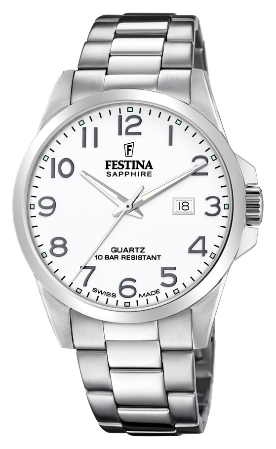 Med Festina F20024/1 herrklockan återvänder Festina till sina rötter i Schweitz. Denna swiss made armbandsur har ett klassiskt utseende, och klockan är helt i silvrig 316L kirurgisk rostfritt stål. Den 9 mm tunn och 41 mm i diameter stålboett sitter mycket bekvämt på handleden och är ackompanjerad med en elegant vit urtavla med tydliga arabiska siffor och en datumvisning vid klockan tre. Urtavlan skyddas med ett safirglas. Festina swiss made kollektion klockor har 2 års garanti och skickas hem i tillverkarens original förpackning.